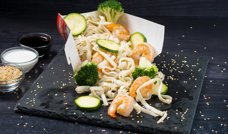 лапша/рис на выбор, креветки, цукини, брокколи, сливки, соевый соус, кунжут.