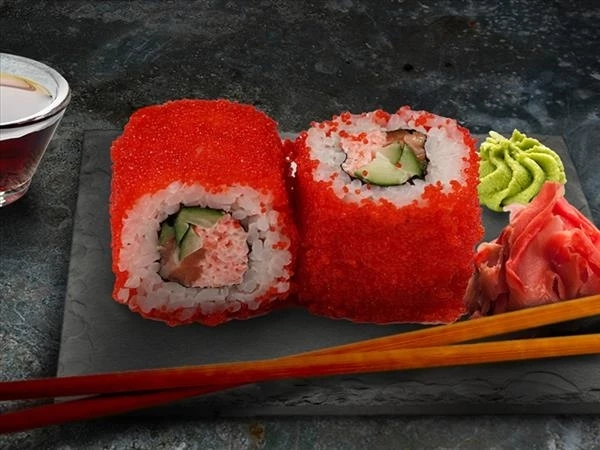 Лосось, рис, нори, огурчик, икра масаго, снежный крабик