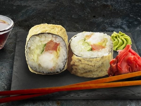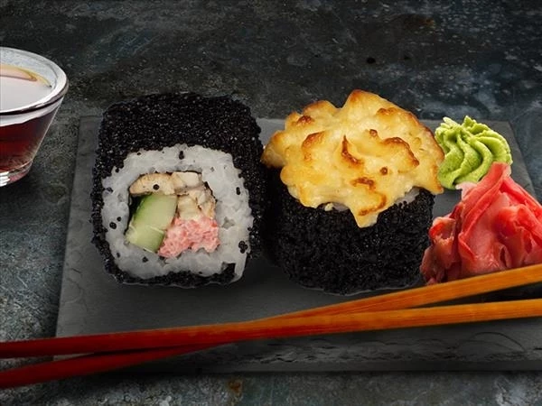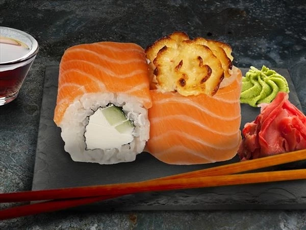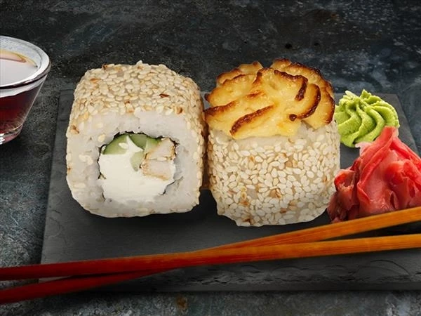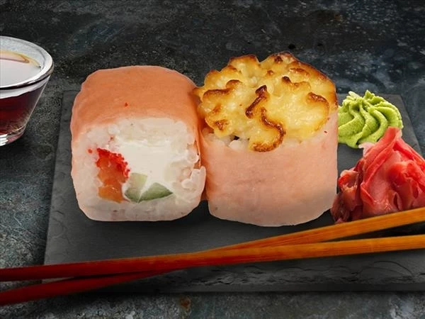Ролл запечённый маменори280 гЛосось, маменори, рис, сыр сливочный, икра масаго, огурчик, пармезан, майонез, соус кимчи