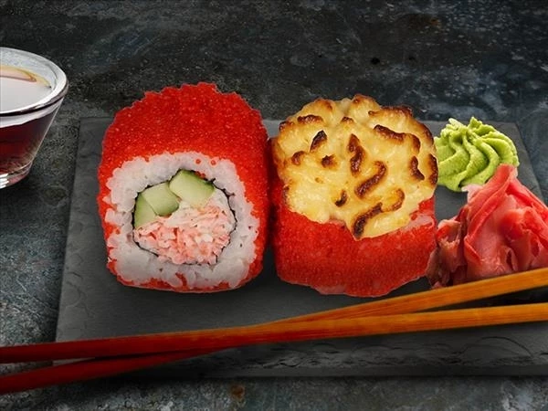 Ролл запеченная калифорния280 гСнежный крабик, икра масаго, огурчик, рис, нори, пармезан, майонез, соус кимчи