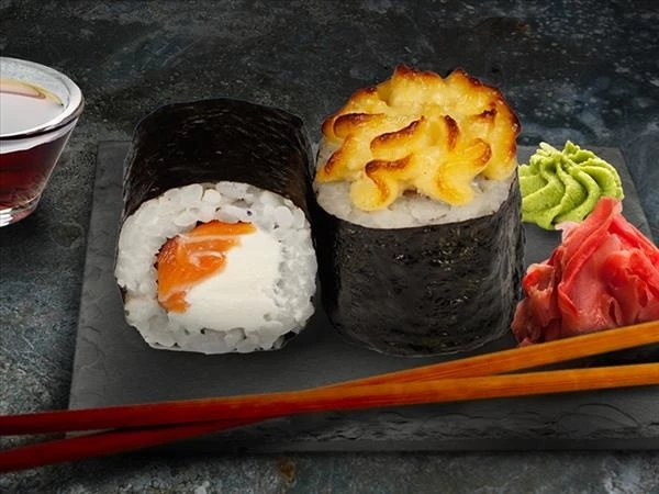 Лосось, рис, сыр сливочный, нори, пармезан, майонез, соус кимчи