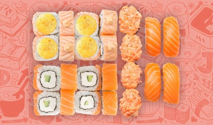 Филадельфия, Запечённая филадельфия, Суши с лососем 4 шт, Гункан с лососем 4 шт/ всего 24 шт.