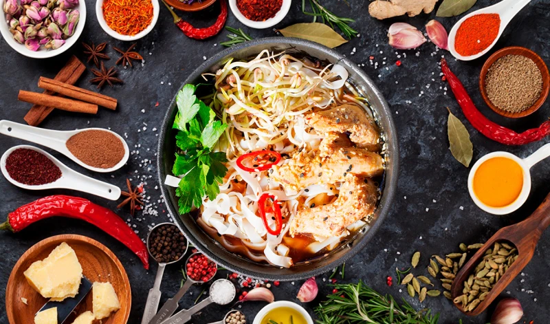 Курочка, бульон суимоно, лапша рисовая,ростки маш, перец чили, зелень, кунжут