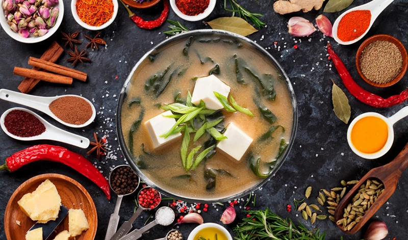 Начинка на выбор, сыр Тофу, шампиньоны, водоросли вакаме, бульон мисо, соевый соус, кунжут