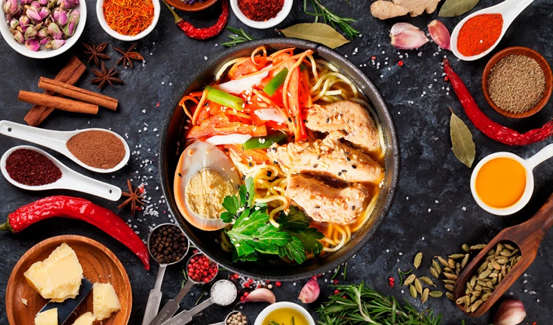Курочка, лапша яичная, бульонсуимоно, морковь корейская, перец, фасоль, яйцо, кунжут, зелень.
