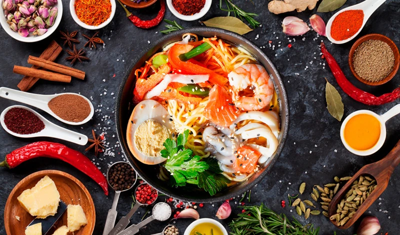 Лосось, креветка, кальмар, осьминог,лапша яичная, бульонсуимоно, морковь корейская, перец, фасоль, яйцо, кунжут, зелень.