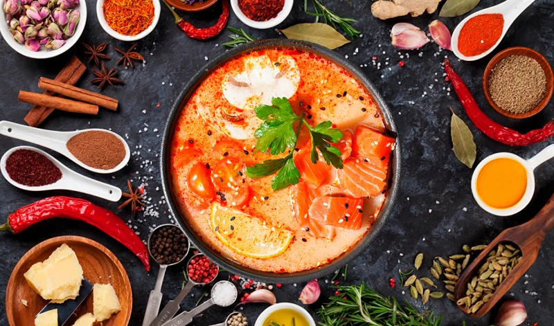 Лосось, молоко кокосовое, бульон том ям, шампиньоны, томаты, кунжут, зелень. Подаётся с рисом 100 гр. и кусочком лайма 5 гр.