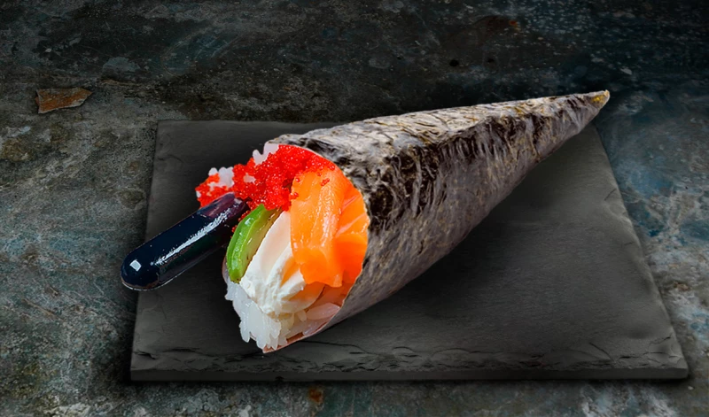 Это блюдо придётся по вкусу любителям морепродуктов. Оно представляет собой порцию риса, завёрнутого в нори, с лососем и спайси соусом сверху. У него приятный вкус, в котором сочетаются нежность лосося и острота спайси соуса